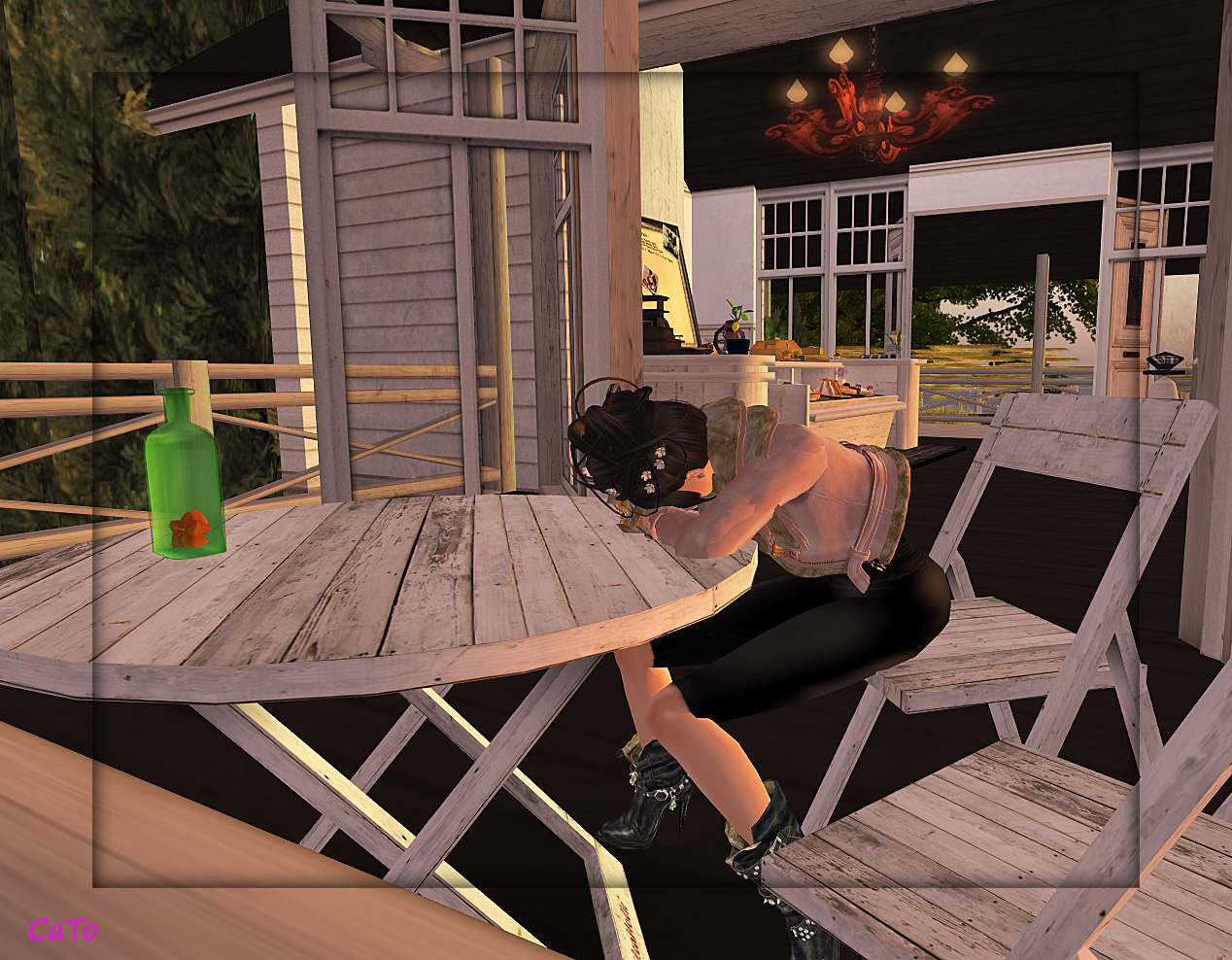 I stumbled across a lovely tea-room on a nice sim, Nonino Sweets. mouth-watering cakes and donuts for display, really well made. The environment is lush and tranquil. I took a moment to admire the cakes and then sat down, almost sad I could not taste them…..(the chairs on the terrace have funny sitposes!).