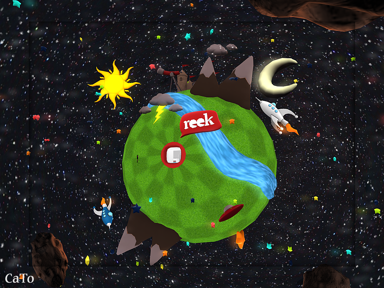 The shop is a cartoon-like planet, surrounded by stars and rockets. It reminds me a bit of ‘Le Petit Prince’.