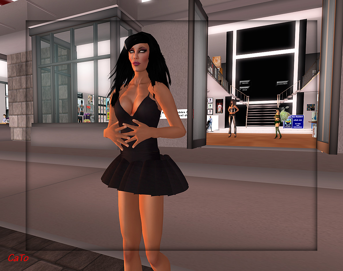 I walked to the nearby freebie-store (the first building you see). Well walked…. I waded through lag, up to my waist in the street. Can happen! I did not give up immediately and purchased a free skin, some hair, a dress, shoes and a shape (all freebies) and was, to be honest, not too thrilled with the result, but hey..This Caity has no money to spend and this was the first hour!