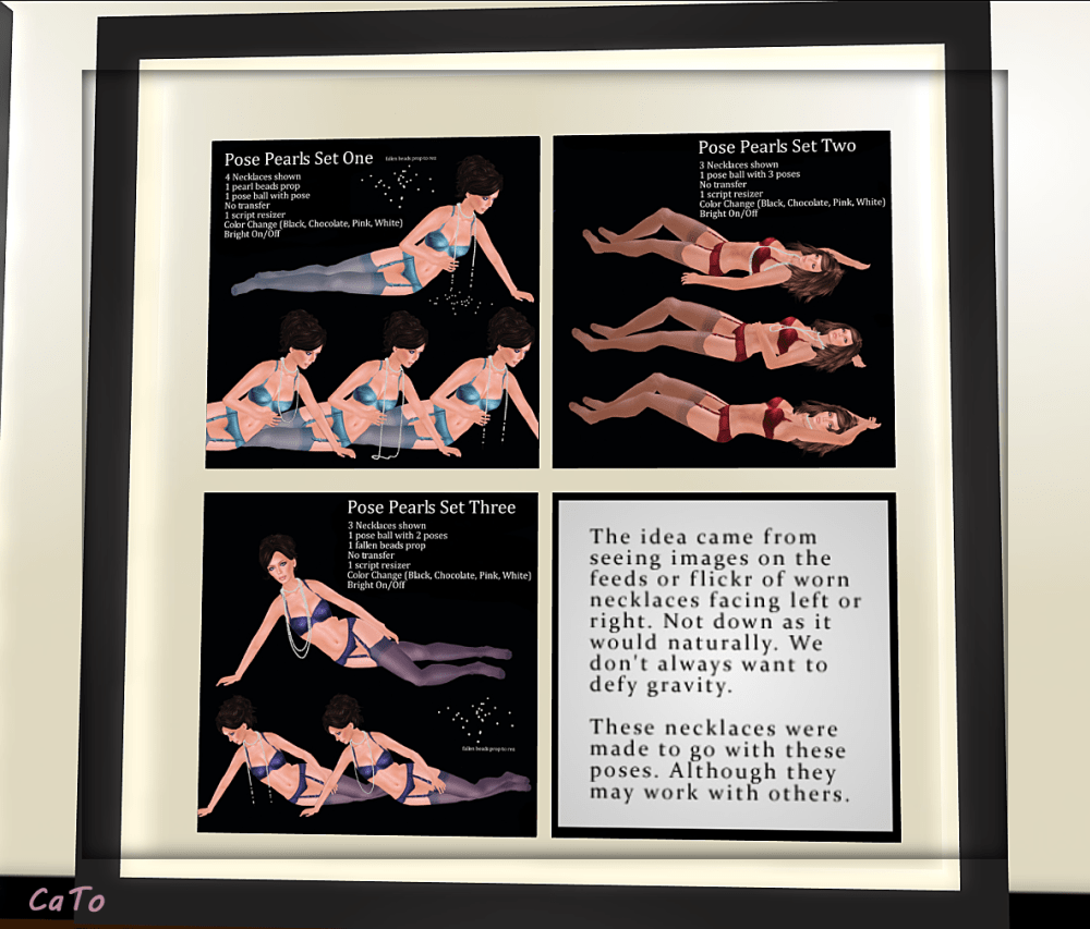 What I particularly liked: necklaces (pearls) that are designed to look good when one poses laying down! Just as in RL a necklace is supposed to obey gravity..and that never happens in SL with your precious pearls!
