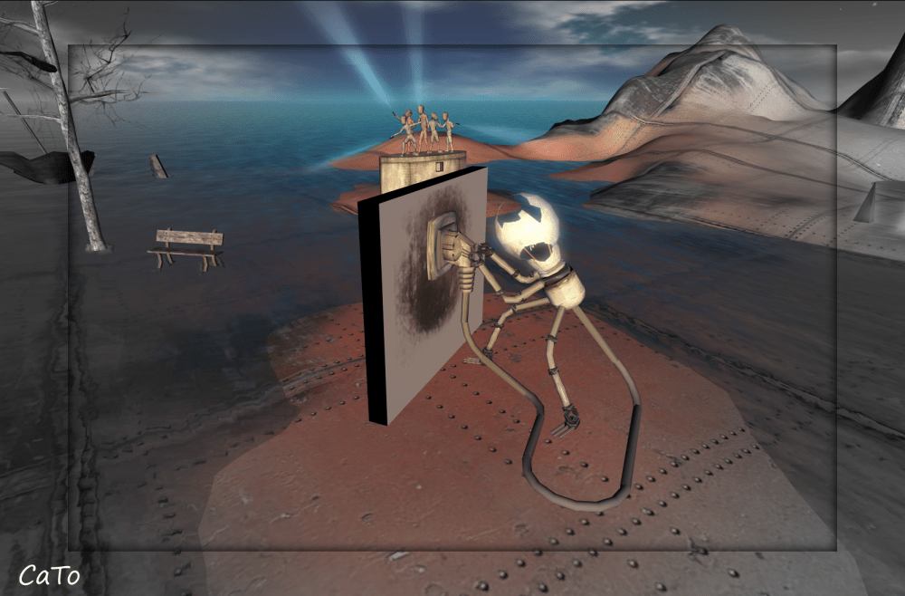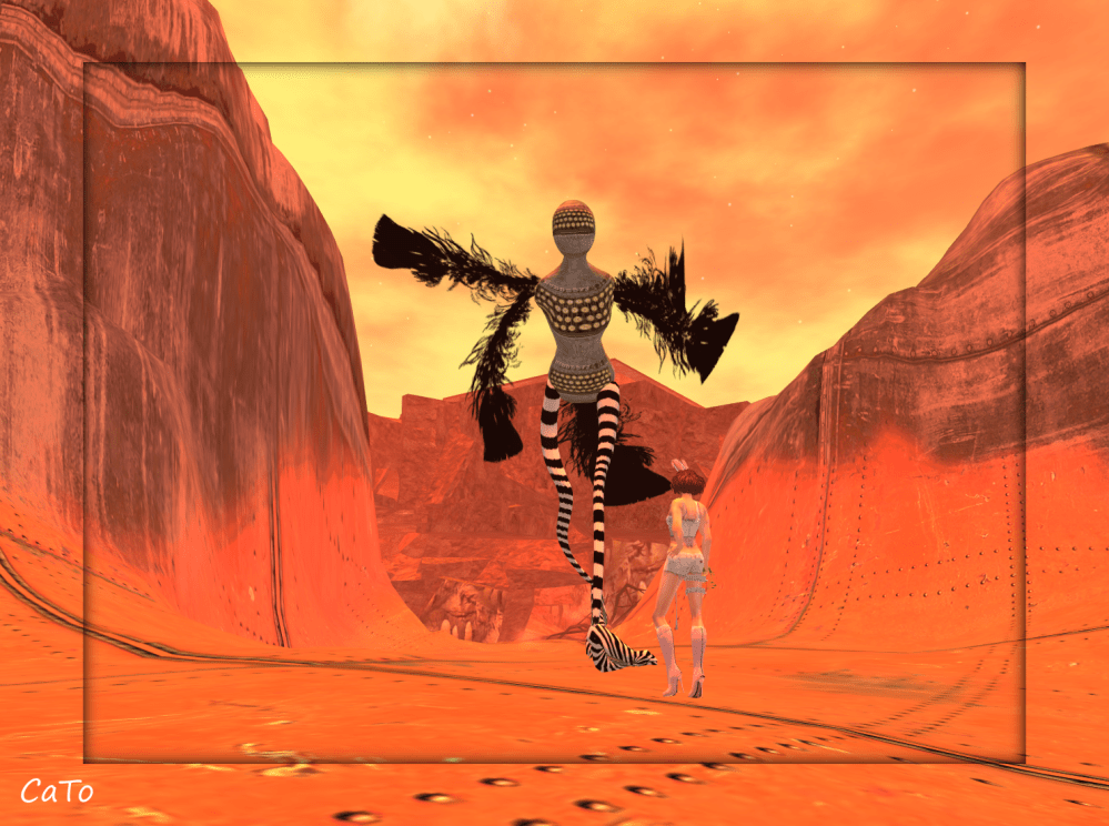 Fridaynight..and after a nice, long nap on the sofa I went to visit Orangelo (M). A colorful sim, filled with art! The texture of the ground is a metal plate, so this gives a completely different look and feel – compared to other ‘SL- lands’!