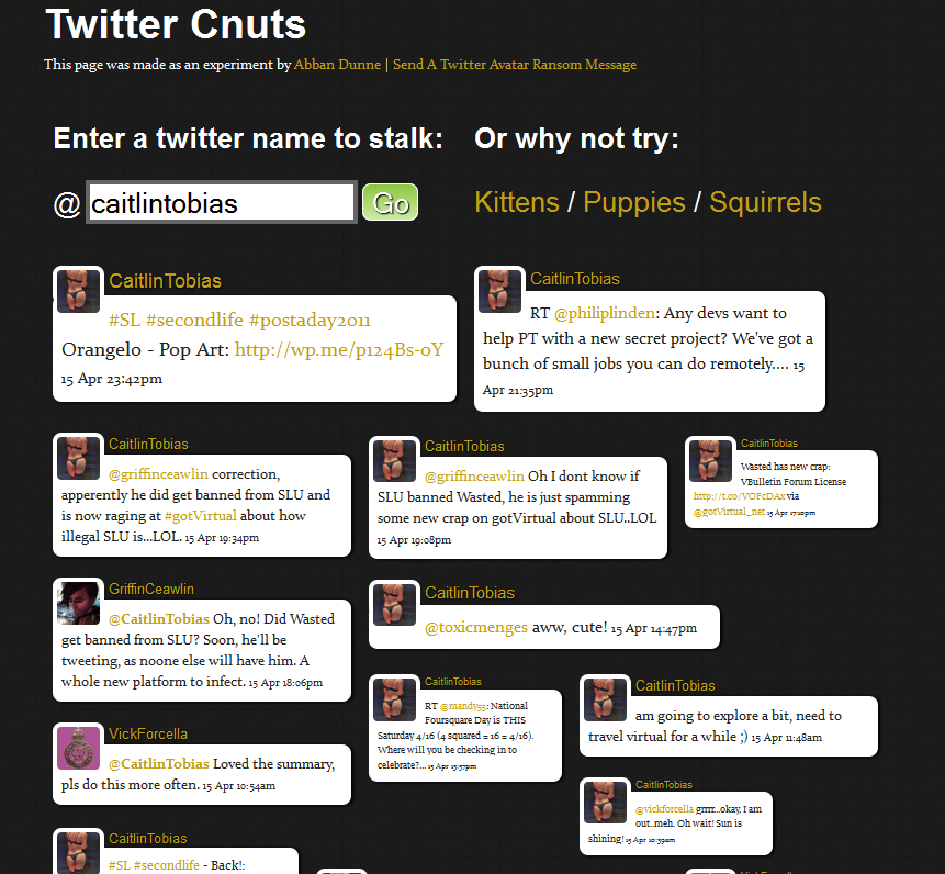 Wanna see? Just go to Twitter Cnuts and type in the name of the person whose tweets you want to read. Or a topic/subject. It’s pretty straight forward, see image…I have ‘stalked’ myself!