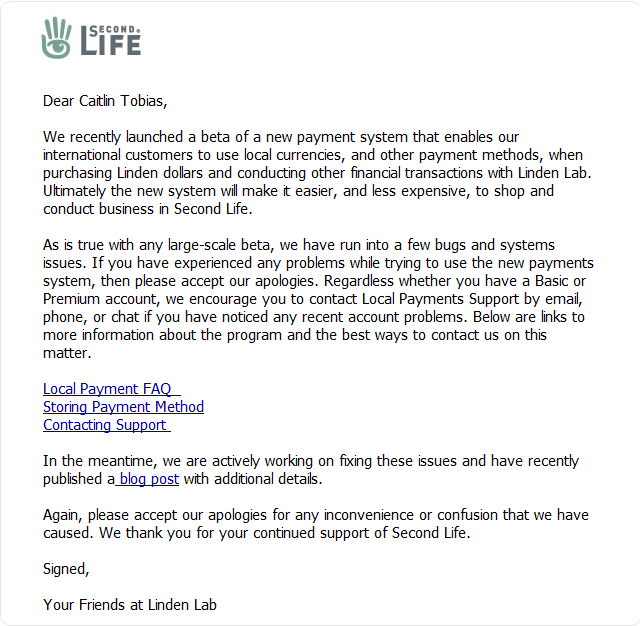 Today I got this email, from Linden Lab. I have been struggling getting Linden Dollars, I can’t buy them inworld nor on LindeX as I used to do, whilst I never changed my payment information! How annoying!