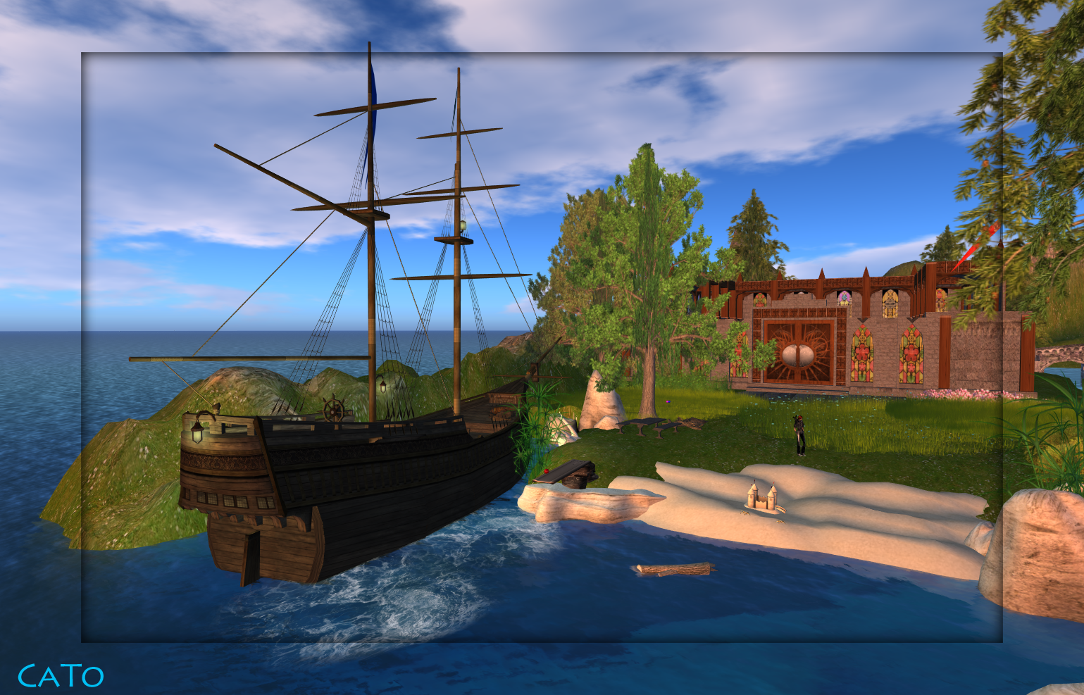 Luckily Ratt had some time as well, and he helped me getting a sandy beach (with a sculpt), he made a nice picnic-table in ImperiuM style and..he rezzed his pirate-ship! Woot!
