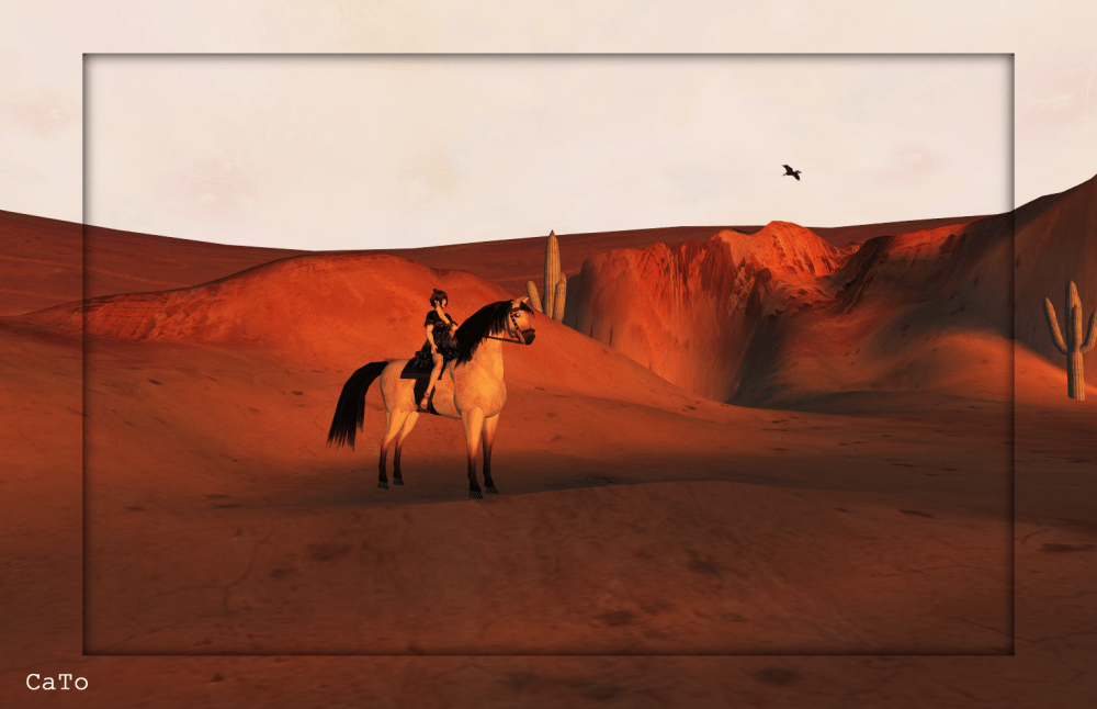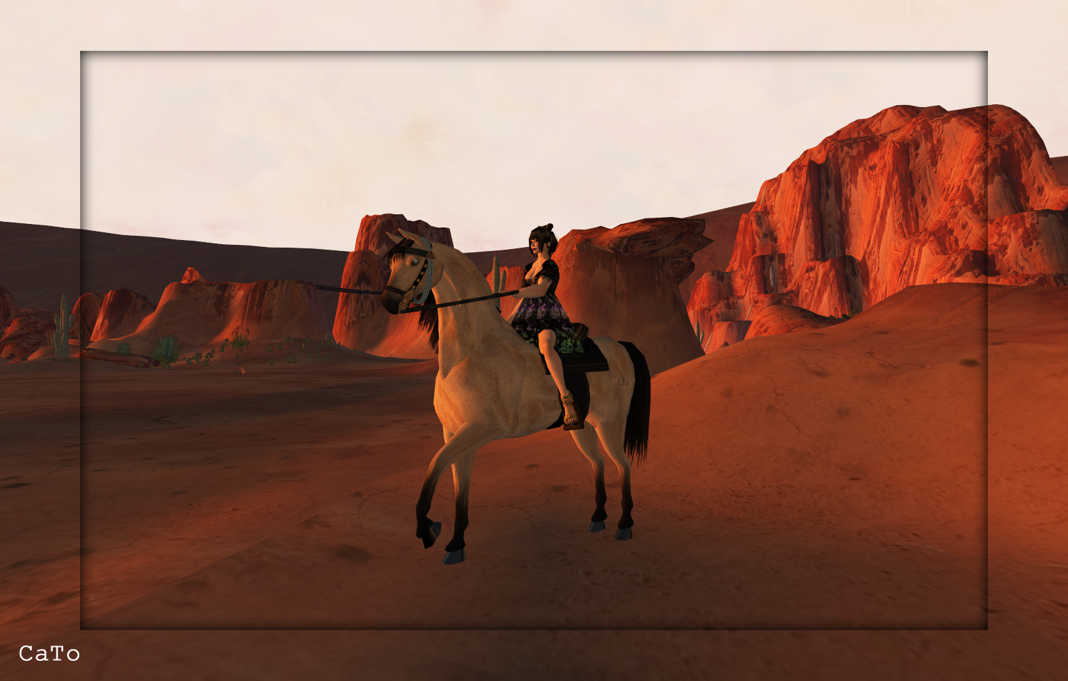 I almost forgot I have a horse in my inventory…I just stumbled across him when cleaning up some folders and suddenly felt the urge to go for a ride! A while ago I discovered a sim called Red Desert – horse country, so I saddled up Ghost and went out!