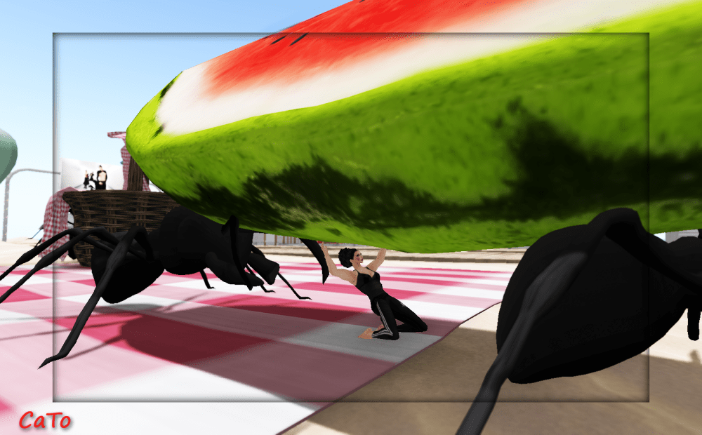 Without seeing any hair – I rubberbanded all over the sims – I ended up on a huge picnicblanket (and sorry, I have no clue on which sim…), with a gigantic watermelon and supersized ants…besides that it looked good, it was also a spot with nice poses, so I amused myself a bit and even dared to push my graphics to highest and enable the realtime shadows (including depth of field). It made me even slower than before, but I managed to take some silly pics and had a good time!