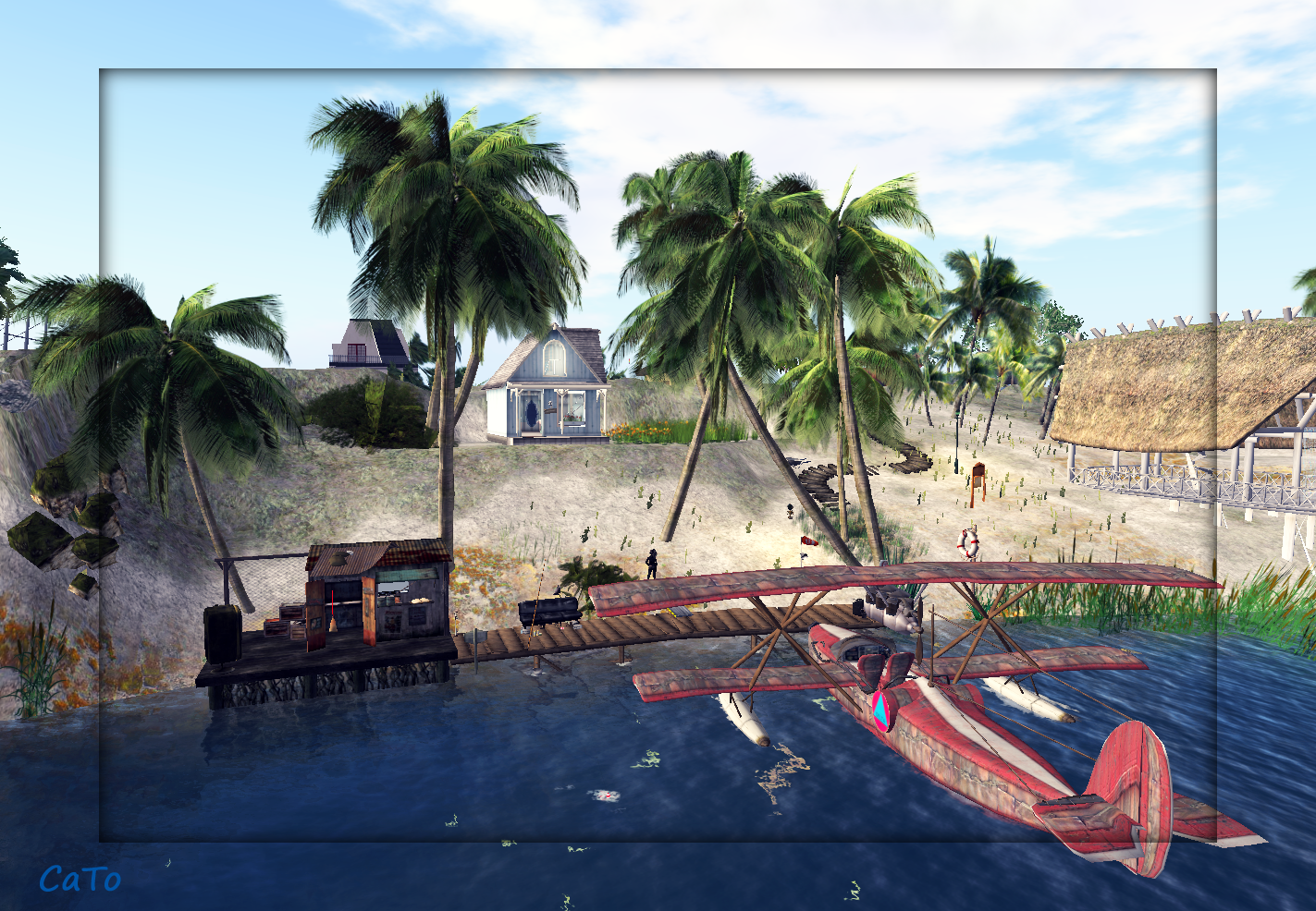 To be honest, there is a small parcel in between mine and the ocean, my neighbour runs a bait-shop and has a waterplane and some boats/yachts. I liked the style of his builds (he has several parcels on the sim – in fact I bought mine from him) so I kept my ground level a bit in the same style as his – he already told me he was happy with that:).