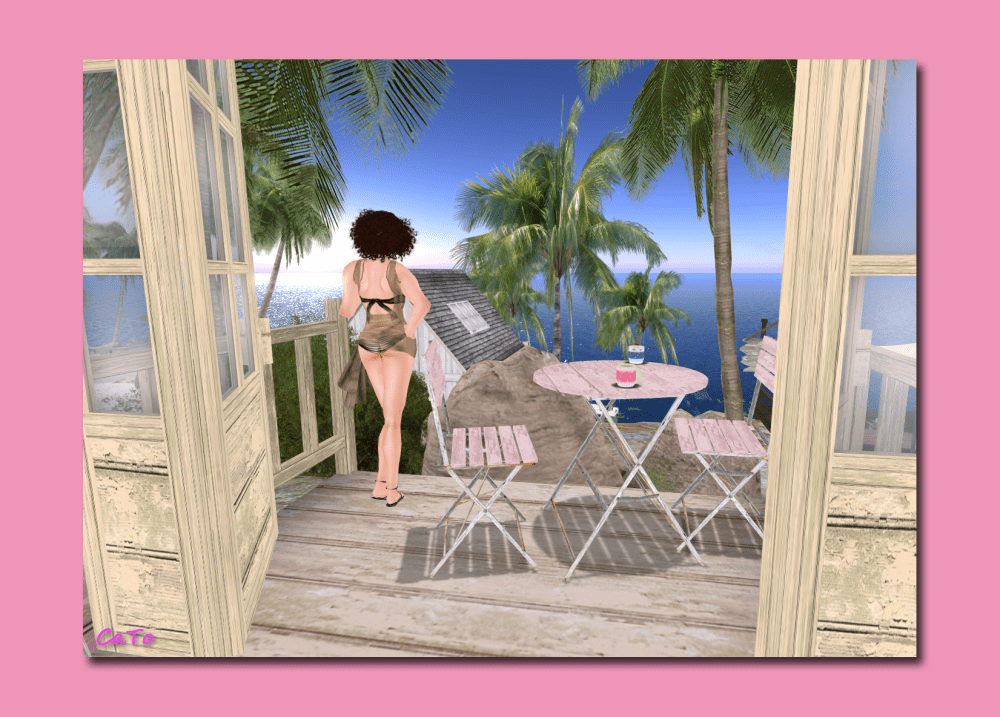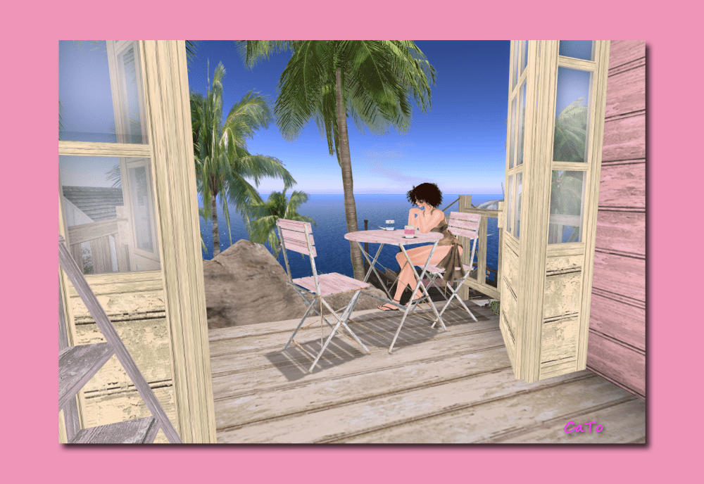 Since the summer in Holland is more than sad (it feels like it’s October already) I have not had the chance yet to have my coffee and croissant outside in the morning sun. I wonder if this is going to happen this year, I fear the worst. So for now, I will just enjoy it inside, wearing joggingpants and a fleece-cardigan and escape to my little beach in SL, for the virtual version – which is how I would like to have it in real…..sigh…