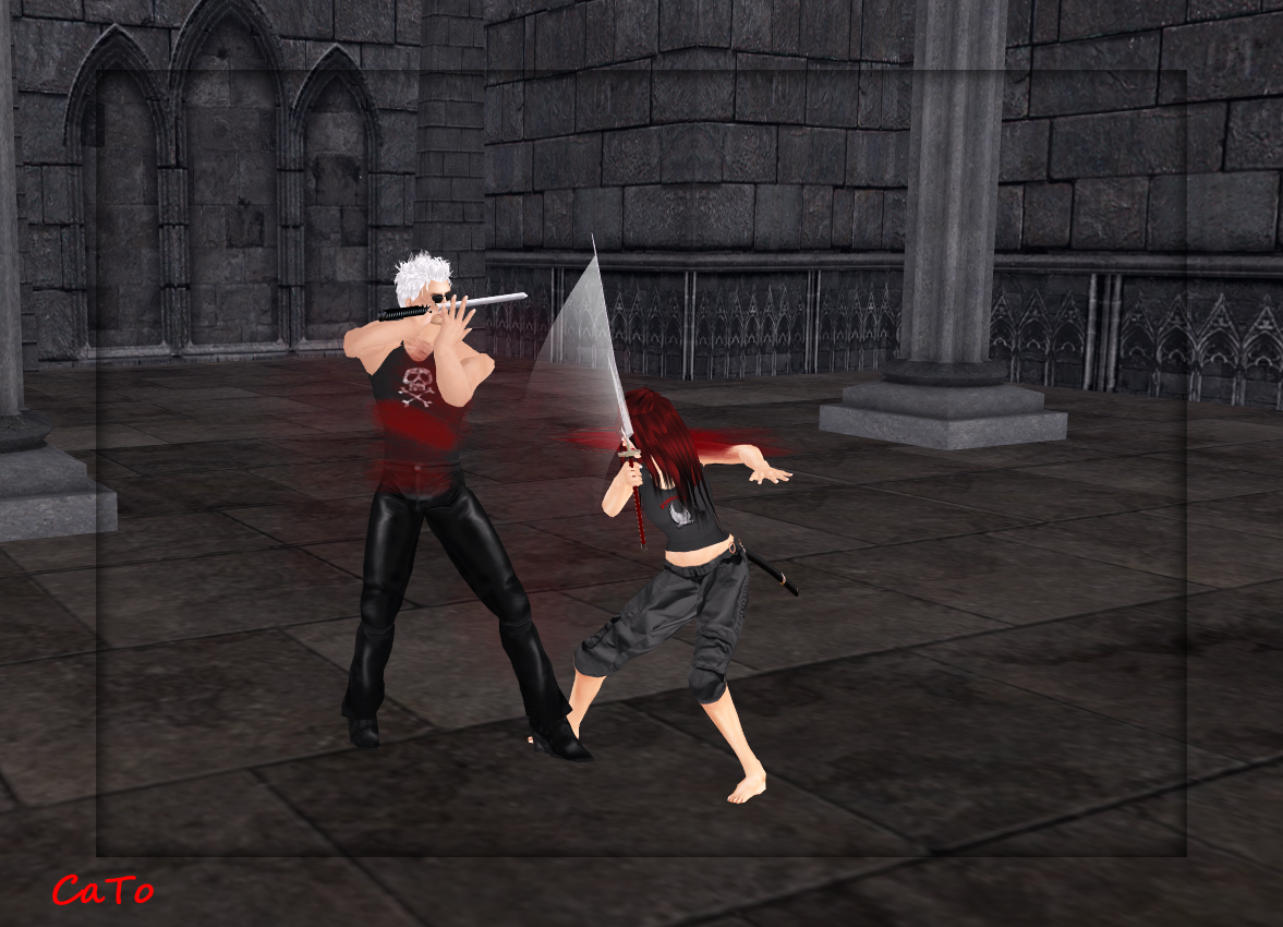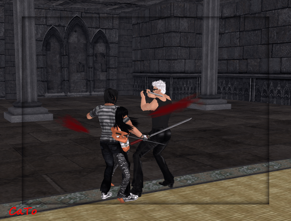 After an hour of non-stop fighting I took a break and tried to make some nice pictures of Ratt, Gihn, Rayne and Luni who were still fighting. It’s always tricky and a decent actionshot is usually a matter of luck. I did not have luck…so the pics are bit odd. Oh well, I blame the animations of the swords!