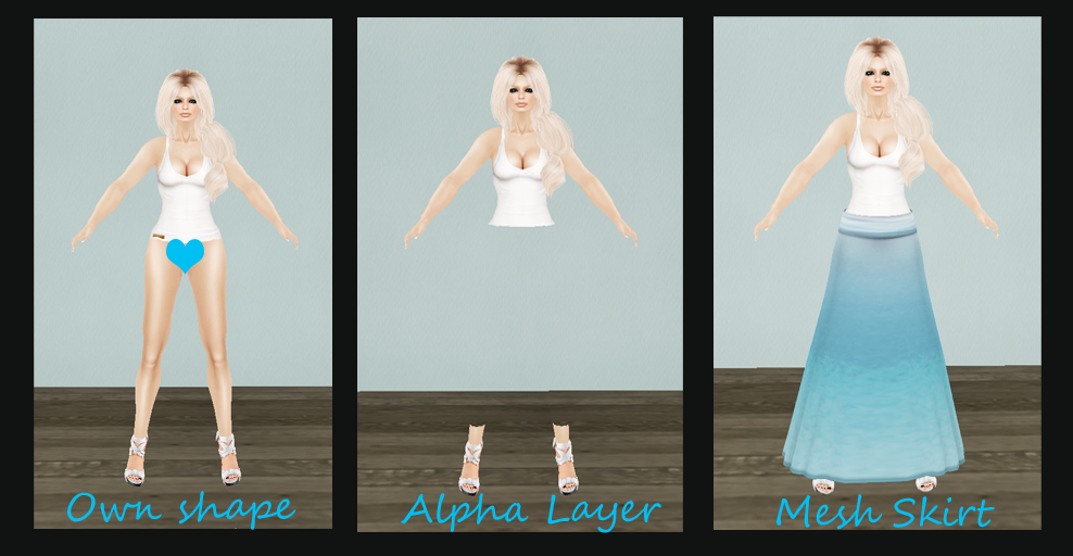 Anyway, what is good to know: mesh cannot be edited/modified. Basically you wear a mesh-prim, which has to come with an alphalayer to make the parts of your avatar invisible on which you wear the mesh-clothing. The piece of clothing has the shape of your avatar already in it, therefore giving it the impression a skirt moves along with your legs.