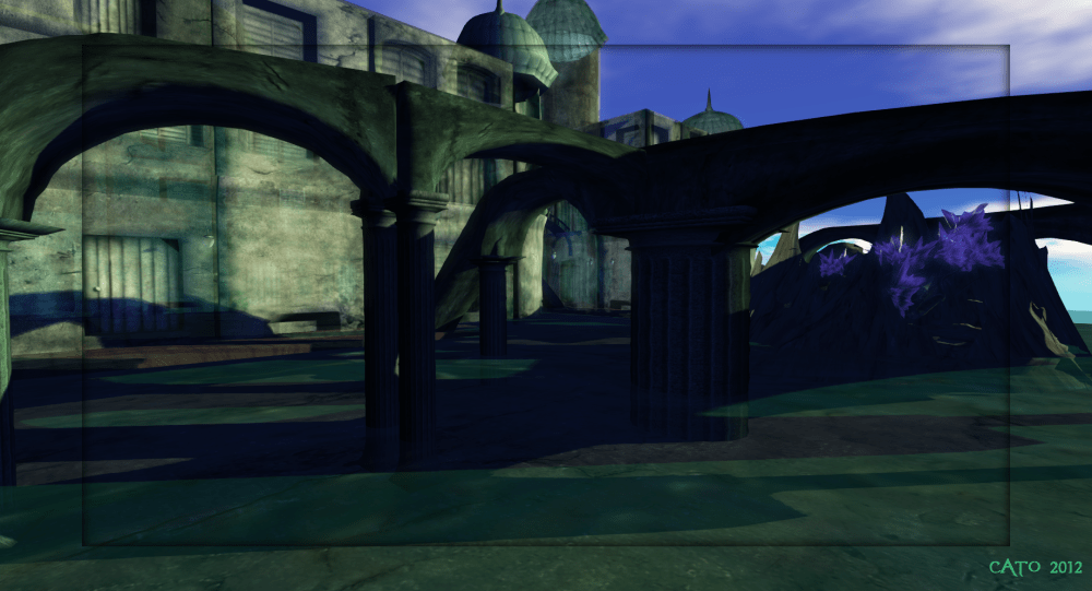 Saturdaynight Sy and I visited the LEA 15 sim, currently featuring several art installations with as central theme ‘Invisible Cities’. One of my favourite is the city created by Rebeca Bashly. On the arrival point you can grab a ‘gondolina’ to wear and to use to ‘sail’ through the greenish canals of what seems like a semi-transparant Venice.