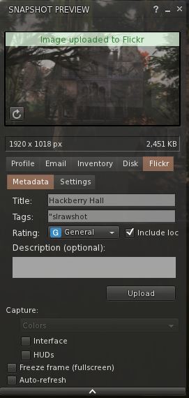 You can see the results on my Flickr (links provided above) but to give a bit more, here’s a screenshot on how the snapshotmenu in Firestorm looks like, when posting to Flickr. In ‘metadata’ you fill in the tags you wish to use, in ‘settings’ you can crop the image, set the rating and as you see you can even include the location – so a SLURL will appear in Flickr in the description of your image.