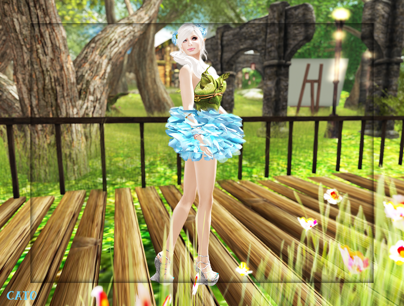 After I had a good look around I took some pics, and ahem yeah..I shopped too: I found a cute blue fairy dress with flowers from Evie’s Closet, and thought it matched my elf ears very well :).