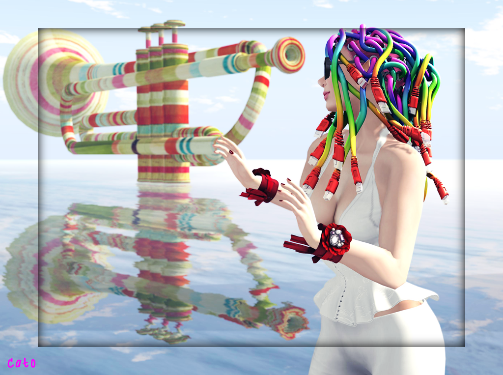 For my trip today I was wearing an almost complete white ensemble…My favourite Maitreya leggings, with a corset from Sakide (part of the Guardian outfit I bought at the Fairy Tales event in 2012), SLink mesh hands and Mandala bracelets and to spice it up: the ‘hair’ is from Discord Designs, the rainbow version, available at The 24 (a cacha item, so it took me 3 tries to get this colour, for 30 LS per try not too much!)