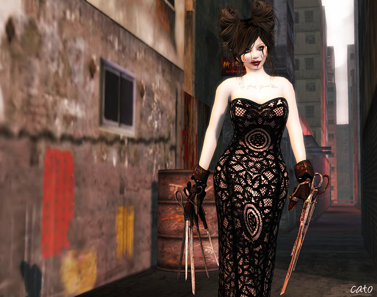 The awesome scissorhands are from Remarkable Oblivion, the gown is from Indyra Originals, my hair from D!va and the messy make-up from *MC*. The tattoo is from The Habitat.