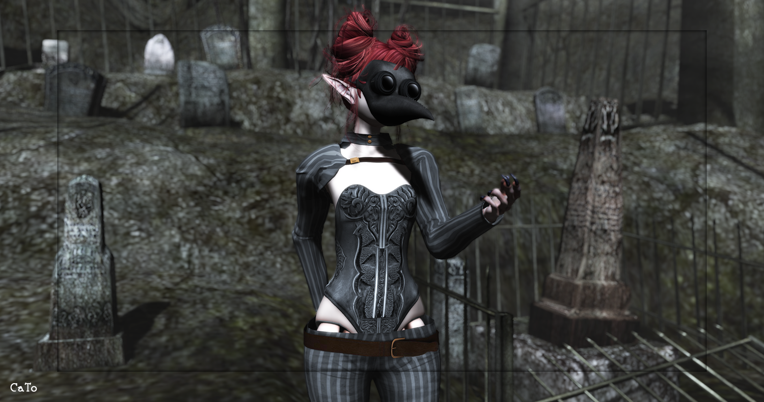 I am wearing the Steampunk Plague Mask from Material Squirrel (it comes with a menu to change textures and colours, male and female version), the jacket and pants are part of the Steampunk Outfit from La Petite Morte. I could only wear the mesh jacket and pants, as this is my mesh doll avatar, but it also comes with a clothinglayer t-shirt. Both these (mask and outfit) will be available at The Clockwork Spiral event which will open its doors today at Noon SLT! (see my blog on ACS for more pics!). The corset is from DOLL Coco and the hair from D!va.