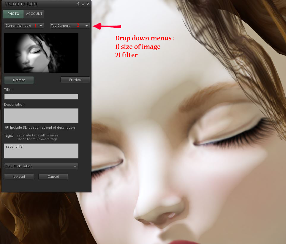 The fun part is beginning, well for me….As you see there are 2 drop down menus, one is for choosing a size of the image and number 2 is a list of some photo-filters! YES! You can….process/edit or how you want to call it, a picture when in Second Life! No photoshop needed, no saving to harddisk…just choose a nice filter and make your own art in the blink of an eye! Now, how cool is that? (Can you tell I am excited?).