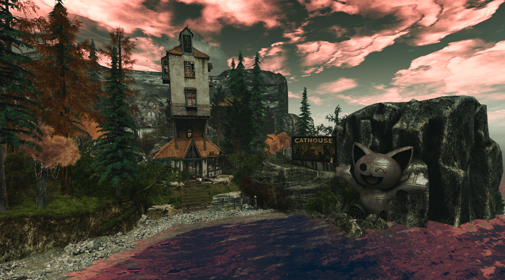 I stumbled across it thanks to a video by Sammie Westland (linked at the end of this post), and despite my real-life issues with anything feline, I got curious. The house looked lovely. Enchanting. Very fairytale core. Very “what if Alice in Wonderland, but everyone purrs.” So I grabbed a mask, hey…you never know, virtual allergies might be a thing one day, and teleported over.