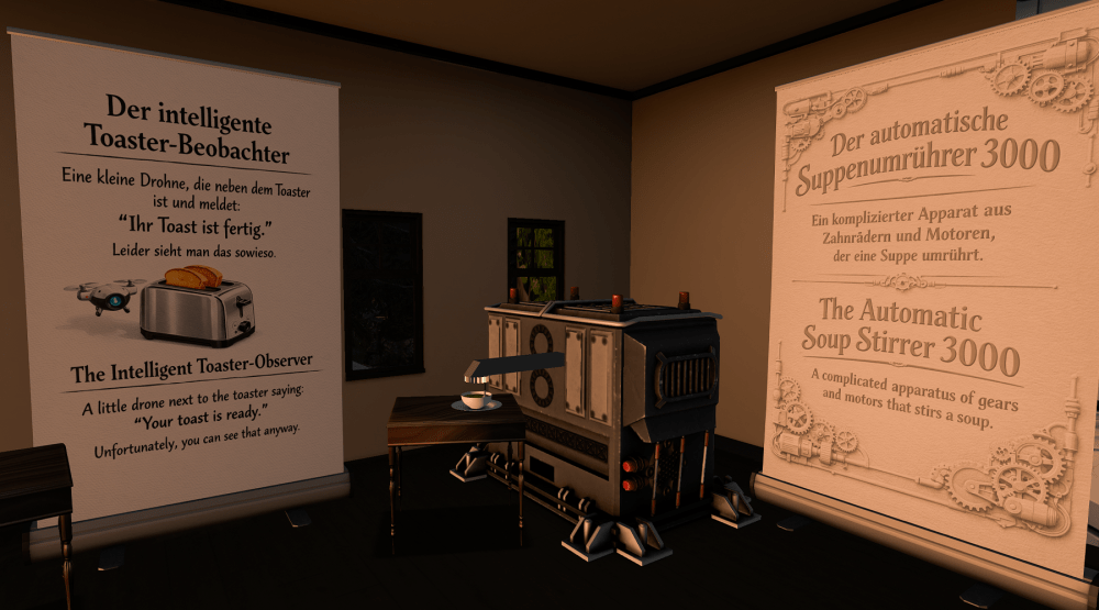 The description in the Destination Guide promised: “curious machines and ideas that are technically impressive but completely unnecessary.” As someone who has spent years in Second Life collecting shoes I never wear and furniture I never sit on, I felt immediately qualified to appreciate the concept.