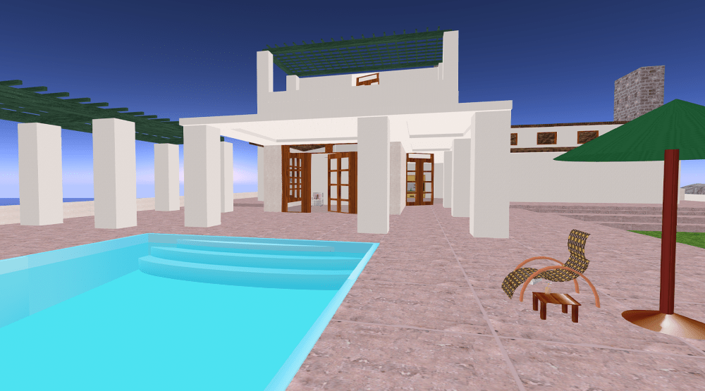 There’s a pool (prim, of course), which looks less like an inviting oasis and more like a blue suggestion of water. The lighting is a nostalgic reminder of a time before Windlight, before EEP, before shadows. I kept it that way when I took the pics for this blog.